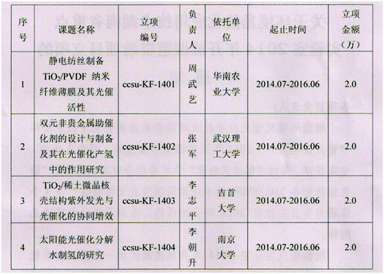 根据环境光催化应用技术湖南省重点实验室(以下简称"重点实验室")2014年开放课题申请通知,经个人申请、专家评审,并经"重点实验室"学术委员会审定,现确定"静电纺丝制备TiO2/PVDF纳米纤维薄膜及其光催化活性"等4个课题为重点实验室2014年开放课题,名单及资助经费请见附件。